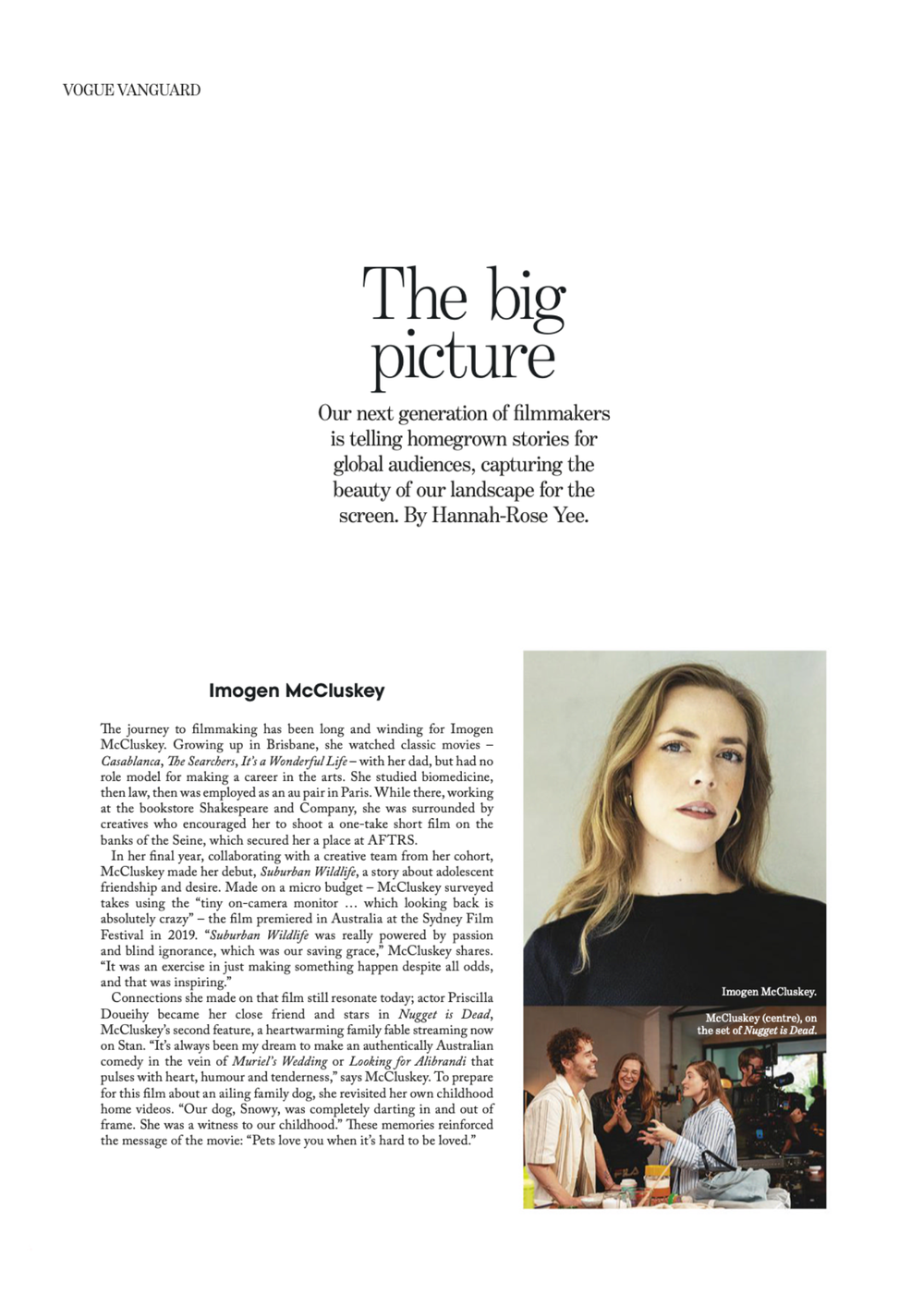 Named one of Inside Films ‘Rising Stars’ and featured in Vogue Australia’s ‘Celebration of Australian Excellence’ issue, Imogen McCluskey is an award-winning filmmaker based between Sydney and London.